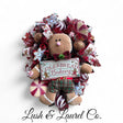 Fresh from the sugar-dusted corners of Lush & Laurel’s holiday workshop, the Gingerbread Bakery Swag is a whimsical teardrop wreath that brings gingerbread dreams to life. Built on a mesh base for fullness and flair, this festive fellow stands approximately 34" tall and 28" wide, bursting with peppermint accents, glittered ornaments, and a plush gingerbread character dressed in plaid shorts and bowtie and wooden peppermint buttons.