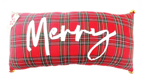 Tartan Lumbar Pillow – “Merry” Embroidered in White (10" x 24")