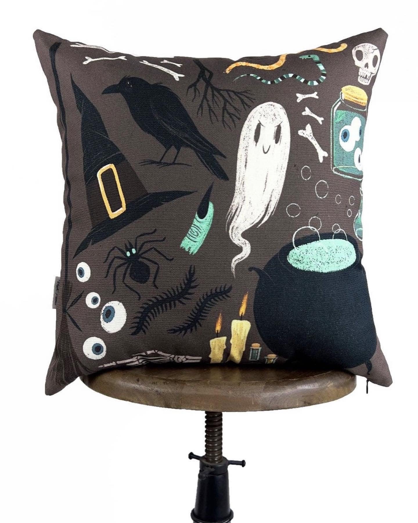 • Pair the collage pillow with black cats, broomsticks, and potion bottles for a full vignette