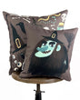 This handcrafted pillow set features two distinct Halloween designs, both set against a warm brown backdrop that evokes autumn nights and bubbling cauldrons:
