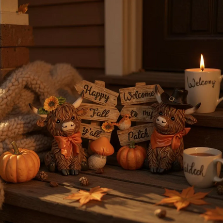 Autumn Highland Cow Tabletop Set – Resin Fall Accent Trio Figurines