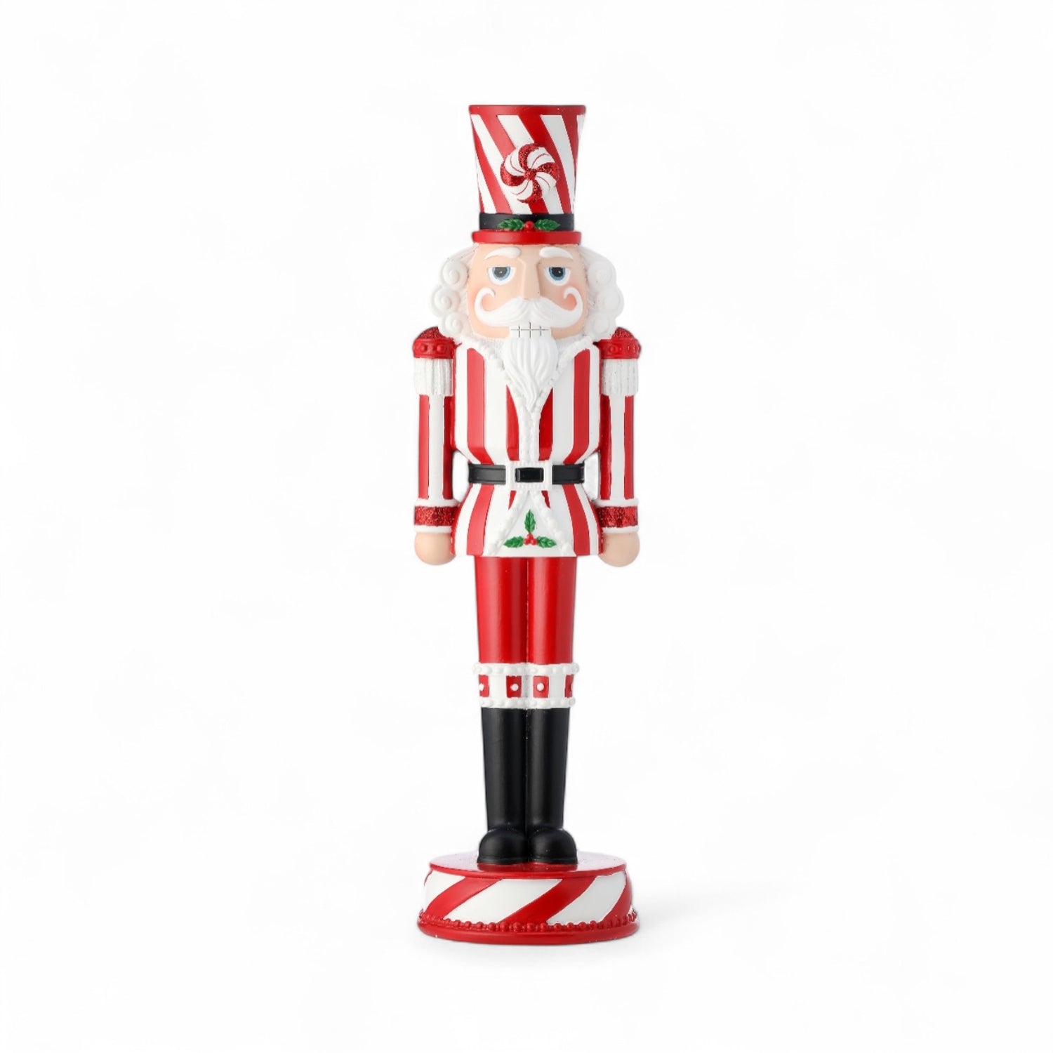 Looking for that final flourish to complete your peppermint theme? Look no further than this dashing 13" Peppermint Nutcracker from Regency International. Dressed in classic red and white with candy-cane striping and a touch of holly, he brings festive charm and a dash of whimsy to mantels, shelves, and holiday vignettes.
