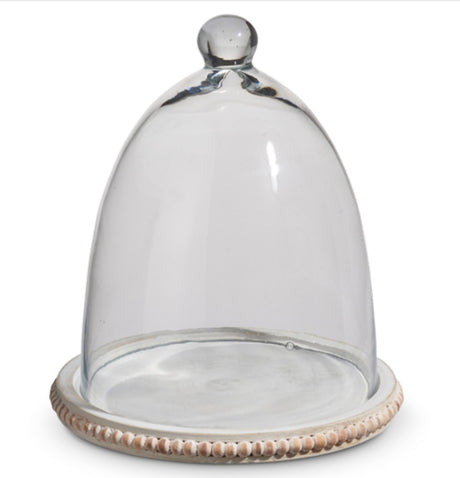 Beaded Tray with Glass Cloche – 11.75" Food-Safe Whitewashed Wood & Glass Display Dome