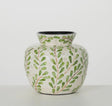 Measuring 9.5" in diameter and 9" tall, its wide-mouth opening allows for effortless styling—whether holding lush greenery, sculptural branches, or delicate florals. The soft green leaf pattern on an ivory background creates a subtle botanical motif, while the contrasting dark interior adds depth and dimension, ensuring a striking visual appeal.