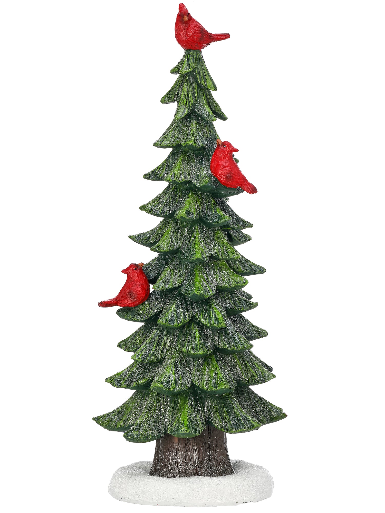 - Sculpted evergreen tree with snowy texture and cardinal accents