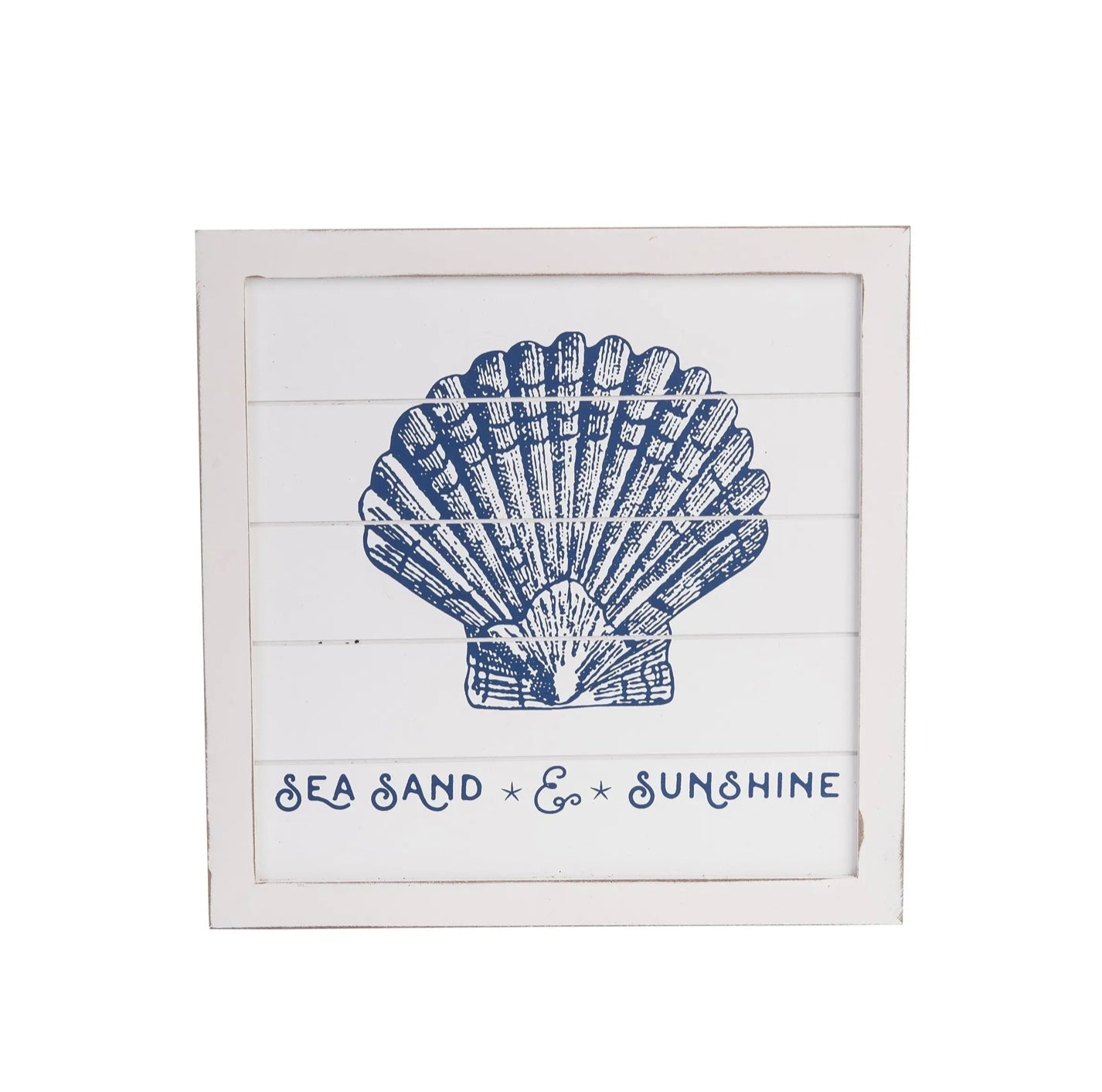 - Vertical wood plaque with blue sea scallop and “Sea Sand & Sunshine” text