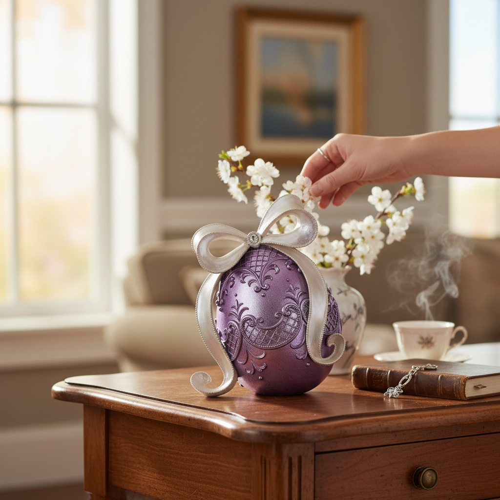 Elevate your spring décor with this beautifully sculpted 12.5" Resin Egg adorned with an elegant bow and jewel accent. Finished in soft cream and lavender tones, this ornate egg features intricate embossed detailing that gives it a refined, heirloom‑quality presence. Substantial in size and rich in texture, it’s a standout accent for mantels, centerpieces, and curated seasonal vignettes.